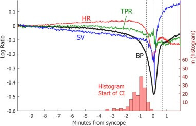 기립성 VVS의 가장 초기 이상 징후는 실신 약 9분 전에 나타나는 SV의 감소로, 이는 정맥 풀링으로 인한 것입니다. 이것은 정맥 혈관 수축을 나타냅니다. 이것은 BP를 감소시키는 효과가 있으며, HR의 증가로 완화됩니다. 실신 직전 약 1분 동안 심박수 감소의 형태로 심박수 억제(CI)가 시작됩니다. CI 시작의 히스토그램은 그 시작이 가변적임을 보여줍니다. 중앙값은 실신 전 58초였습니다. CI는 혈압 강하를 가속화하여 실신으로 끝납니다. CI가 활성화되는 동안 TPR이 약간 더 감소하여 정맥 VD 및 CI의 훨씬 더 강력한 효과에 동맥 혈관 수축이 추가됩니다.