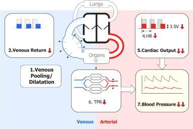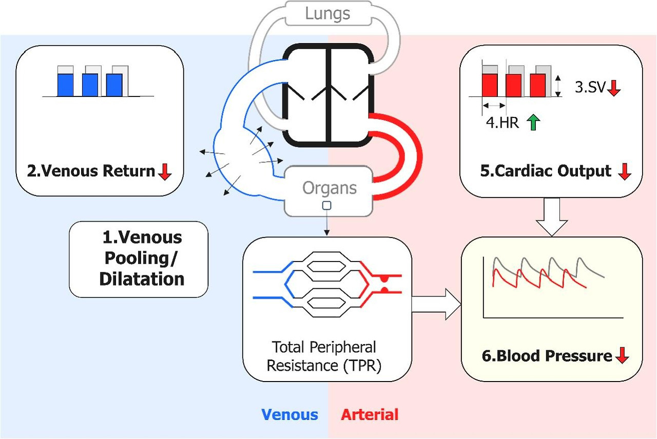 기립성 VVS의 이상은 정맥 풀링(1)으로 시작되며, 여기에서는 정맥 혈관 확장으로 표시됩니다. 심장으로 돌아가는 혈액의 양이 감소(2)하여 SV(3)가 감소합니다. 이 감소는 HR(4)의 증가로 부분적으로 보상되지만, 충분하지 않아 CO(5)가 감소합니다. 이 단계에서 TPR은 변하지 않고, BP는 감소합니다(6). 일반적인 BP 패턴은 수축기 BP가 이완기 BP보다 더 많이 감소하는 것입니다.