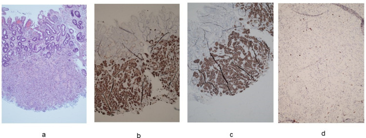 Neuroendocrine tumor (NET) G1, diameter: 3 mm, ki-67: 1.4%. (a). Hematoxylin-eosin staining (20× magnification). (b). Immunohistochemical staining for synaptophysin (20× magnification). (c). Immunohistochemical staining for SSTR2 (20× magnification). (d). Immunohistochemical staining for ki67 (40× magnification).