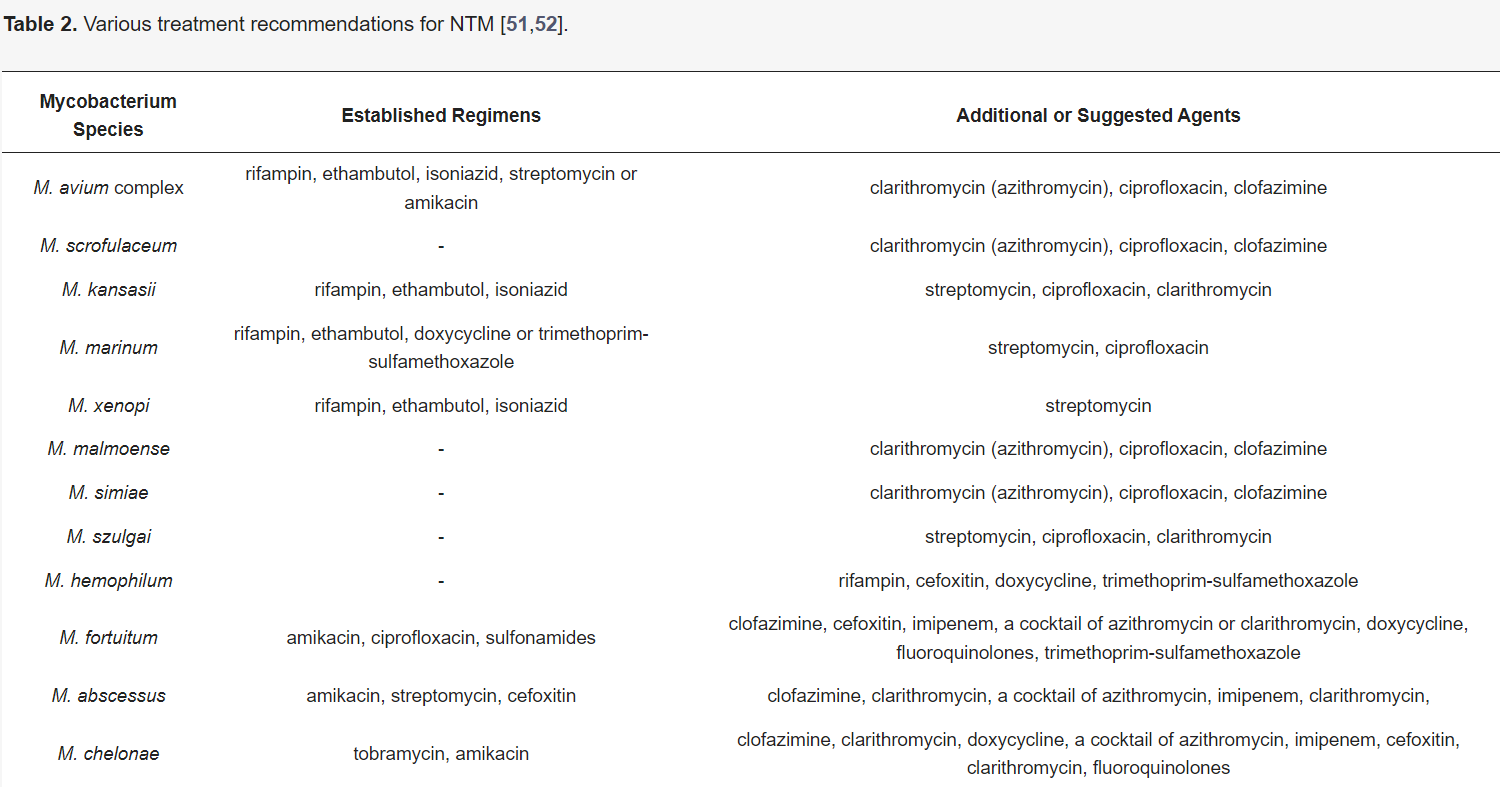 마이코박테리아의 소수성과 금속 내성은 종종 세포의 부착과 이후 수중 표면에서의 생물막 연속적 발달을 가능하게 합니다. 또한 수돗물의 NTM은 일반적으로 생존할 수 있으며 글루타르알데히드 및 염소와 같은 화학 물질에 내성을 보이는 경우가 많습니다[169,170]. 이러한 비결핵성 마이코박테리아가 정지된 생물막에서 증식하여 개인에게 감염을 확산시키는 것은 병원 환경에서 주목할 만한 건강 위험을 보여줍니다 [171]. 치료 효능을 향상시키는 잠재적 항생물막제제를 활용한 새로운 접근법이 개발되어야 하며, 이는 비결핵성 마이코박테리아 감염 환자의 적절한 치료를 위해 시급히 필요합니다.