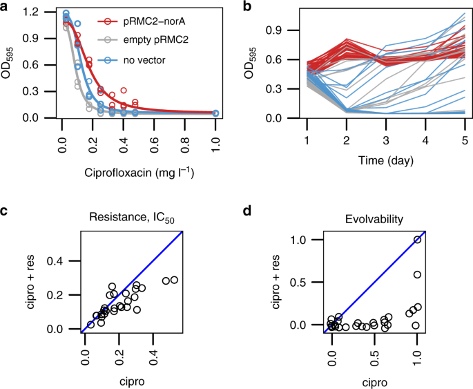 a The effect of norA overexpression on ciprofloxacin resistance. Resistance was measured in the RN4220 cells overexpressing norA from vector pRMC2 under a native promoter (red), compared to an pRMC2 empty vector control (grey) and a vector-free control (blue). N = 3 independent cultures were used per treatment per concentration. Dose-response curves show model fit from the analysis presented in Supplementary Table 8. b The effect of norA overexpression on the evolution of ciprofloxacin resistance. Optical density (λ = 595) was measured for five daily transfers with 1 mg l−1 of ciprofloxacin in RN4220 cells overexpressing norA from the pRMC2-norA vector (red), cells with the empty pRMC2 vector (blue) and the cells without the vector (grey). N = 40 independent cultures were used for each type of cells. Statistical analysis in shown in Supplementary Table 10. c The effect of reserpine on intrinsic resistance. Intrinsic resistance to ciprofloxacin (IC50, mg l−1) was determined for a representative set of 27 strains in the presence (y-axis) or absence of 33 µM reserpine (x-axis) (N = 5 per dose/reserpine combination). Two-sided Wilcoxon signed-rank test: W = 308, d.f. = 26, p = 0.003. d Evolvability was determined for the same set of 27 strains with 33 µM reserpine (y-axis) or without reserpine (x-axis). Evolvability was measured as the probability of population survival after 5 serial transfers at 1 mg l−1 of ciprofloxacin (N = 16 replicate populations for each strain/reserpine combination). Two-sided Wilcoxon signed-rank test: W = 226, N = 27, p-value = 0.000128.