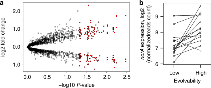 a Plotted points show the average difference (high evolvability−low evolvability) in gene expression between 14 pairs of high and low evolvability strains. Gene expression was measured after 1.5 h of exposure to ciprofloxacin (1 mg l−1) and each point represents a gene in the MRSA252 transcriptome (the number of genes is n = 2047). Significantly differentially expressed genes are coloured red (p < 0.05, two-sided Wald tests) and norA is coloured blue. P-values were adjusted using Benjamini-Hochberg method. b The expression of norA in low and high evolvability strains. The read counts for the norA gene were normalised by sequencing depth. Pairs of strains are connected with a line (the number of pairs was N = 14). Two-sided Wald test: log2 fold-change = 0.979, standard error = 0.246, t = 3.979, adjusted p = 0.006802703).
