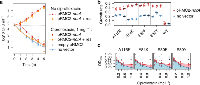 a Exponentially growing cells were exposed to 1 mg l−1 of ciprofloxacin and viable cells counts were estimated by plating on TSB agar. Four treatments were compared: (i) norA overexpression = red solid line, (ii) norA overexpression and reserpine (33 μM) inhibition = orange solid line, (iii) empty vector control = grey line, and (iv) no vector control = blue line. In addition, cell density was measured in treatments (i) and (ii) without ciprofloxacin (red dash-dotted line and orange dash-dotted line, correspondingly). For each time-point, six independent replicates per treatment were measured (with the exception of the pRCM-norA cells in ciprofloxacin at 0 h which had N = 5). The lines show model fit for polynomial regression (F23, 191 = 622.6, p-value < 2.2e−16). Post-hoc comparisons are shown in Supplementary Table 14. b Growth rate of grlA mutants with or without norA overexpression. We estimated the growth rate of the RN4220 wild type (WT) and three independently obtained mutants carrying each grlA substitution in the presence of 1 mg l−1 of ciprofloxacin. Growth rate in cells carrying pRMC2-norA (red) or cells without the vector (blue) was determined using growth curves shown in Supplementary Fig. 10b. Black horizontal lines show the mean growth rate of independent cultures (N = 6 per mutant/treatment combination for A116E, E84K, S80F and S80Y, N = 11 for WT pRMC2-norA and N = 12 for WT no vector). Paired two-sided t-test comparing the means in the mutants with and without pRMC2-norA: t = 11.958, d.f. = 11, p = 1.206e−07. Two-sided t-test comparing pRMC2-norA and no vector control in WT: t = 0.96281, d.f. = 12.136, p = 0.3544. c Representative dose-response experiments for grlA mutants. Red lines show mean optical density with norA overexpression, and blue lines show mean density without overexpression. Black arrow shows the concentration used during experimental evolution. Five independent cultures were used per mutant/treatment/concentration. The results for all mutants are shown in Supplementary Fig. 10a. The difference of means between pRMC2-norA and no vector cells at 1 mg l−1 for all mutants was tested using two-sided paired t- test: t = −18.712, P = 1.09e−09, d.f. = 11.