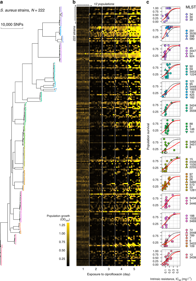 a Maximum-likelihood phylogeny of S. aureus strains included in this study. The tree was constructed using a whole-genome alignment of 222 strains mapped to the S. aureus MRSA252 reference genome and corrected for recombination. b Population growth during experimental evolution. Five heatmaps show optical density (λ = 595) of bacterial populations at the end of each transfer. The optical density varies from low (no growth, OD595 < 0.08, black) to high density (high growth, OD595 > 1, bright yellow). In each heatmap, the columns correspond to 12 replicate populations, and the rows correspond to 222 strains. c The correlation of population survival and intrinsic resistance in 14 phylogenetic clusters. Each data point represents one strain where population survival is the proportion of replicate populations that evolved resistance, and intrinsic resistance is IC50 (half growth inhibition dose) of a parental strain. Colour and shape for each strain indicate MLST (multilocus sequence type). An open circle is shown when MLST could not be determined. 222 strains were assigned to 14 phylogenetic clusters based on a genetic distance matrix obtained from the phylogenetic tree in (a). The black curves show a model fit for the logistic regression between survival and intrinsic resistance across all 222 strains (the same for all clusters, GLM: χ2 = 393.93, d.f. = 1, residual d.f. = 220, p < 2.2e−16), and the red curves show cluster-specific effects. Post hoc tests for cluster-specific effects are shown in Supplementary Table 6.