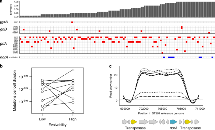a Resistance mutations in the evolved S. aureus populations identified by whole-genome sequencing (N = 121). The panels shows the identified mutations in gyrA, grlB and grlA (red) or the amplification of norA gene (blue). The populations are ranked by the evolvability of their parental strains shown as barplots on top of the panel. b Mutation rate in high and low evolvability strains. We measured the mutation rate to rifampicin resistance using a Luria-Delbruck fluctuation test. Lines in the figure connect pairs of high and low evolvability strains (N = 11 pairs). Two-sided Wilcoxon signed-rank test: W = 0.8311, P = 0.8311, N = 12. c Copy number across sites spanning the 7239 bp region that is amplified in ST3535 and ST291 evolved strains. Copy number was calculated by summing the number of reads per site, normalized by the mean sequencing depth across all sites mapping to the ST291 reference genome, and smoothed using a generalized additive model. Gene annotations are shown below: yellow = ISSau1 transposases; blue = norA.