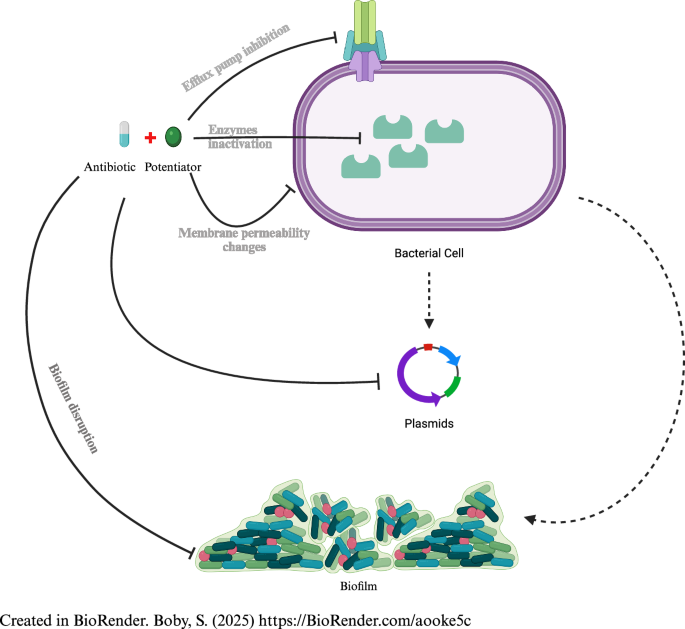 Both natural and synthetic compounds can act as antibiotic potentiators. However, their potential is often undermined or unexplored. Antibiotic potentiators include natural compounds such as alkaloids, phenolic compounds, stilbenes, and terpenes, and synthetic compounds such as synthetic peptidomimetics and nanoparticles16,17,18. Synthetic potentiator molecules are widely used alongside antibiotics in clinical settings and have demonstrated successful results; however, further research is needed on natural potentiator molecules19. Many previous studies have explored the capability of these agents as antibiotic potentiators. However, the exact mechanism of action needs to be identified for their safe and effective use. Therefore, this review article discusses the need for antibiotic potentiation, various potentiator molecules, and the potential mechanisms involved.