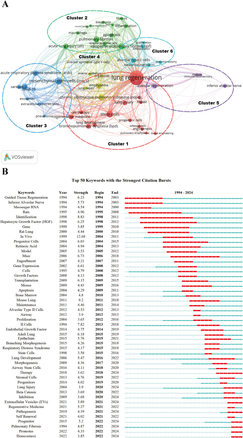 The formation of these trends reflects both the driving effect of technological advancement and the pulling effect of clinical needs. Particularly, the COVID-19 pandemic outbreak accelerated the translation process from basic research to clinical applications, making “therapy” one of the strongest burst words. In the future, with further integration of multidisciplinary technologies, alveolar regeneration research is expected to achieve breakthrough progress in individualized treatment and clinical translation.