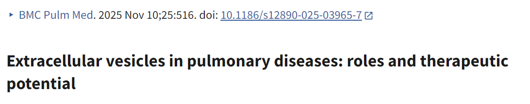 | Extracellular vesicles in pulmonary diseases: roles and therapeutic potential | 2025 Nov 10 Madison Coward-Smith 등 | 서술적 리뷰: EV 생합성, 폐질환 문헌 분석. | EV가 면역 조절과 병리에서 역할; 줄기세포 유래 EV가 염증성 폐질환(예: COPD)에서 폐 수복·재생 촉진. 바이오마커 및 치료 타겟으로 유망. | 줄기세포 EV가 COPD 같은 염증 질환에서 폐세포 재생 유도 가능; 표준화·임상 번역 필요. |