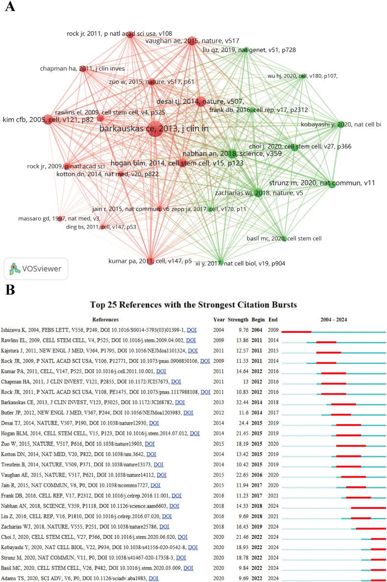 Keywords timeline analysis further reveals that “stem cells” and “progenitor cells” have continuously appeared since 2000, with “progenitors” and “self renewal” becoming burst words during 2020–2024. This evolutionary trajectory indicates that research focus has shifted from early stem cell identification toward in-depth exploration of stem cell behavioral regulatory mechanisms. The highly cited studies by Desai et al. [44] and Kim et al. [14] respectively elucidated the differentiation potential of AT2 cells and BASCs, explaining why stem cell heterogeneity has become a current research hotspot.