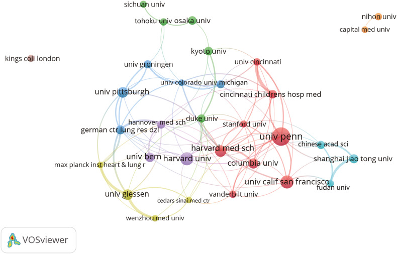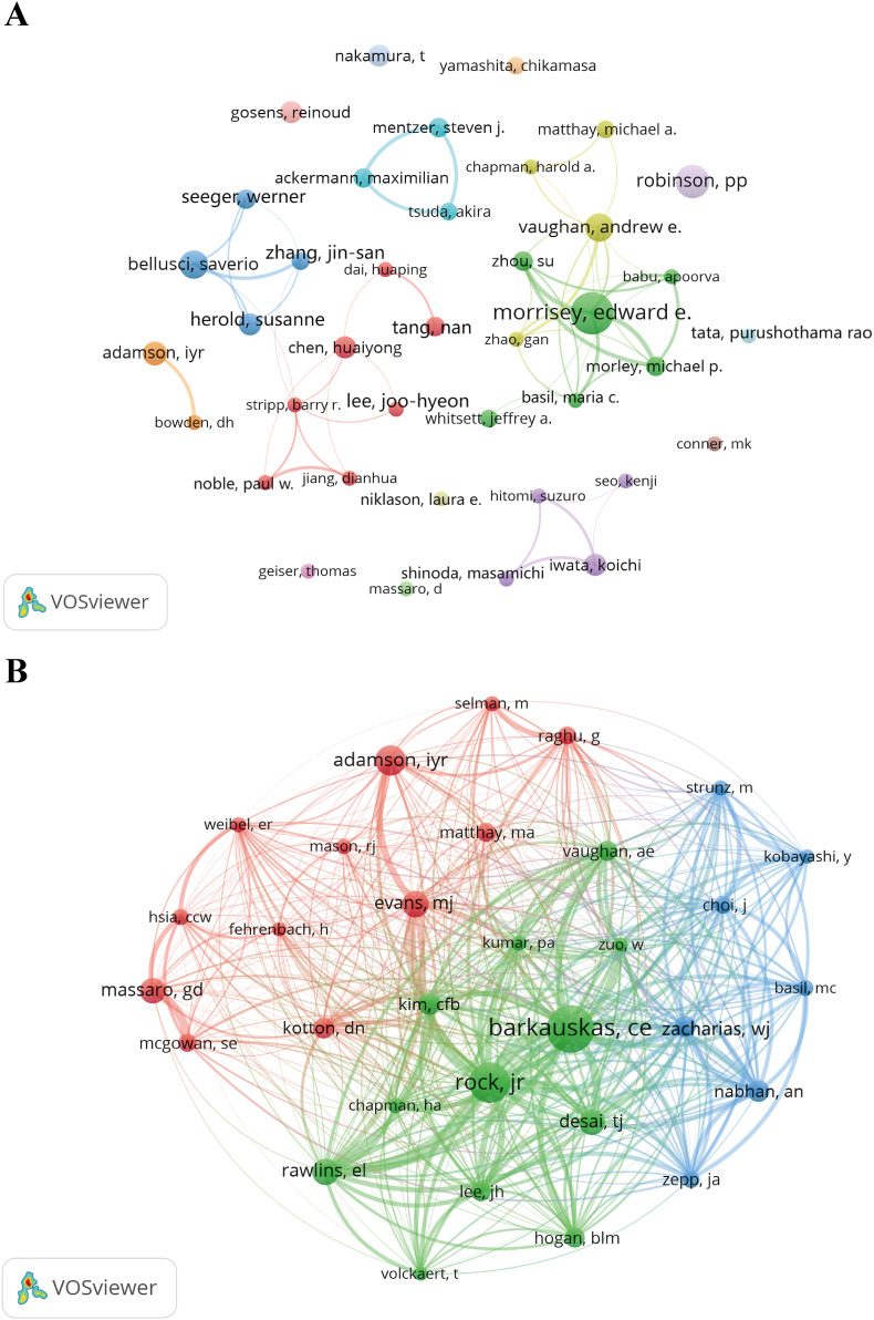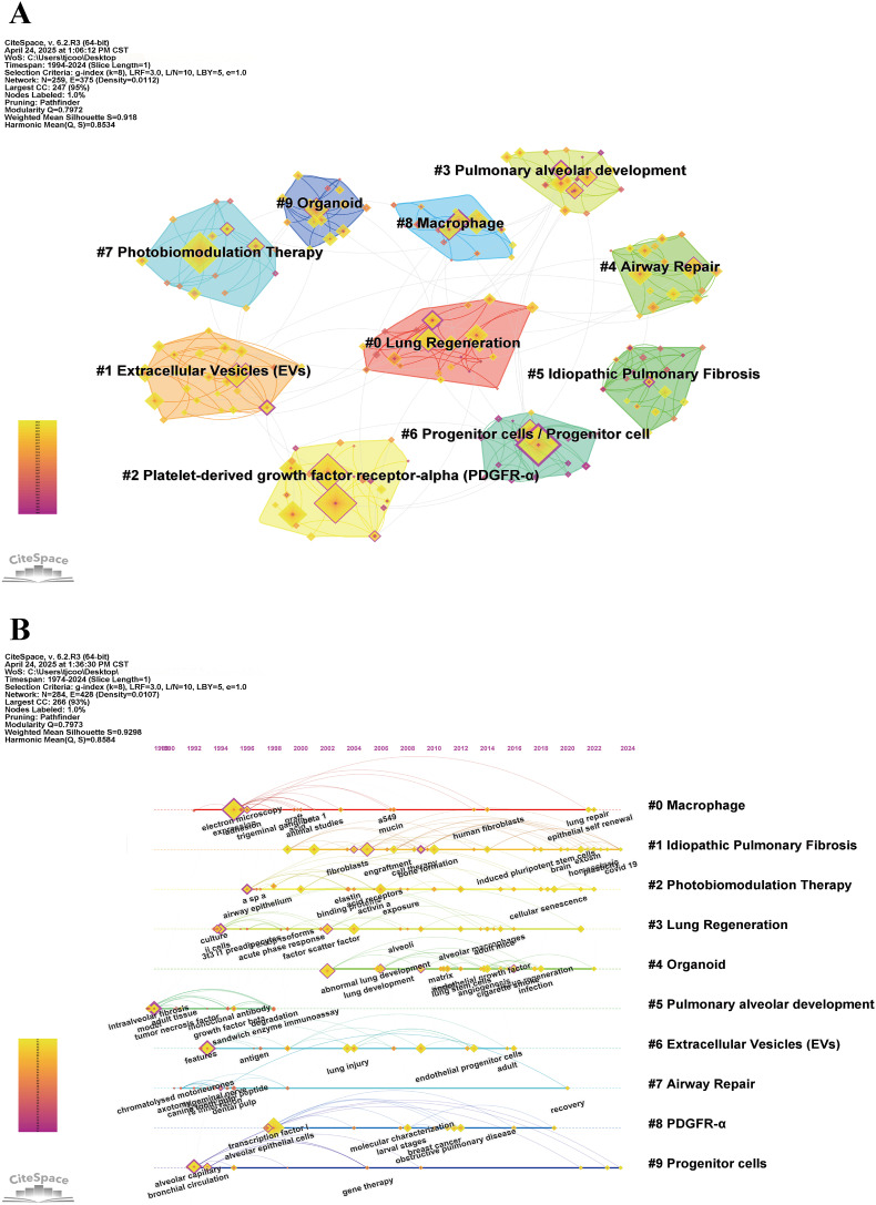 “Pulmonary fibrosis” became a burst word during 2020–2024, while IPF appeared in multiple keyword clusters, reflecting the importance of this disease as a model for studying regeneration failure mechanisms. Institutional collaboration networks show close cooperation between major institutions studying IPF (such as University of Michigan, Yale University) and institutions studying normal alveolar regeneration, reflecting a research strategy from pathology to physiology.