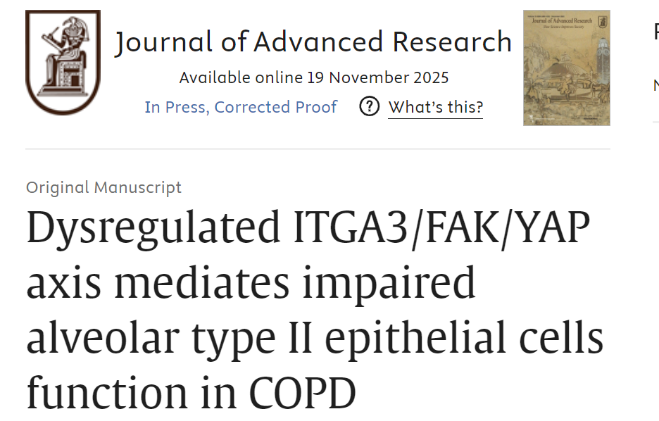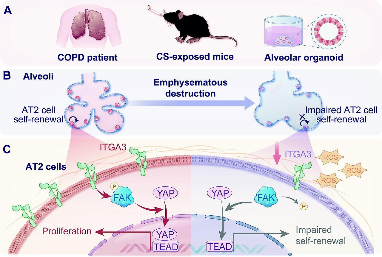 | Dysregulated ITGA3/FAK/YAP axis mediates impaired alveolar type II epithelial cells function in COPD | 2025 Nov 19 (Online ahead of print) Li Liu 등 | scRNA-seq: 환자·CS 쥐 모델 AT2 세포 분석; 오가노이드·in vivo NAC(ROS 제거제) 테스트. | CS가 ROS 축적으로 ITGA3 억제, FAK/YAP 경로 장애로 AT2 자가재생·증식 저하. NAC이 ITGA3 복원·FAK/YAP 활성화로 폐기종 완화. | ROS/ITGA3/FAK/YAP 축이 COPD AT2 재생 장애 핵심; ROS 타겟팅으로 재생 회복 가능, 신규 치료 타겟. |