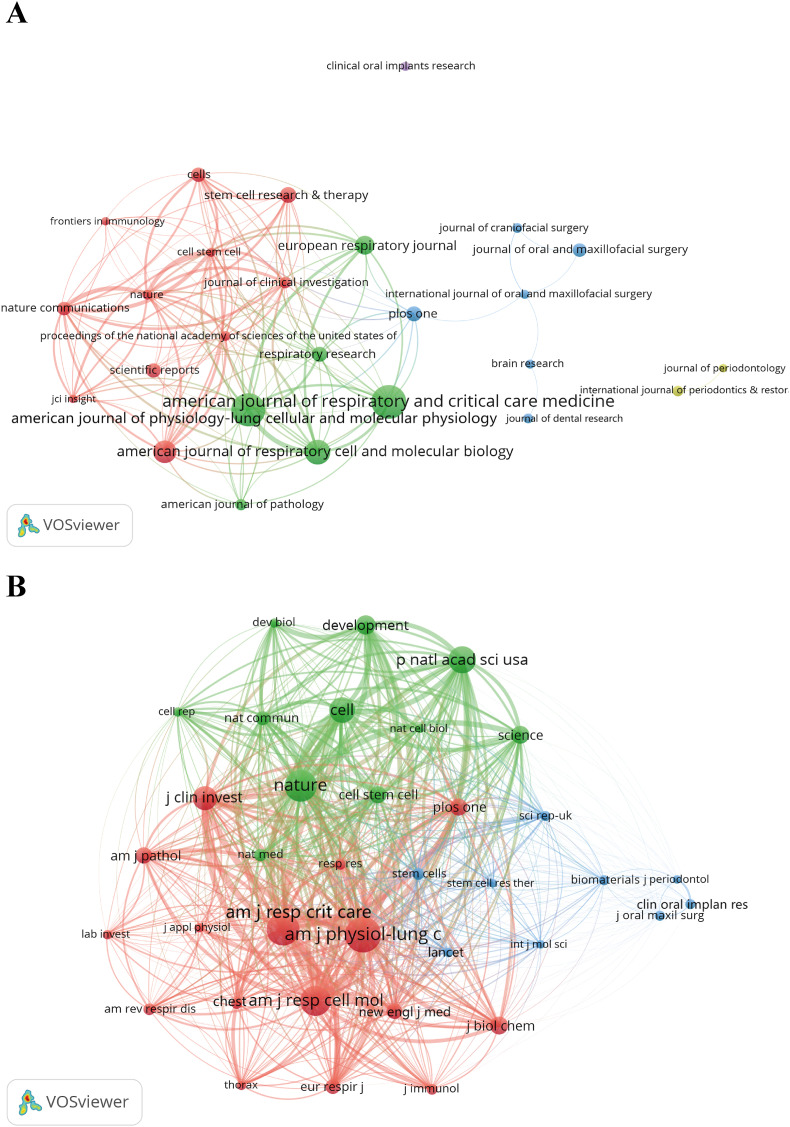 Citation burst analysis shows that “EVs” demonstrated significant bursts during 2020–2024, closely related to urgent demands for cell-free therapy following the COVID-19 pandemic. Our journal co-citation network shows that journals publishing EVs-related research have expanded from traditional respiratory medicine journals to comprehensive journals such as Nature Communications, indicating that this field is gaining broader attention from the scientific community.