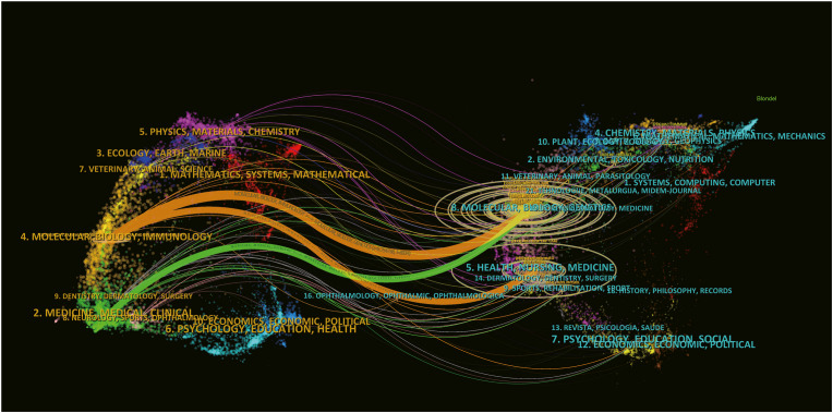 CiteSpace (version 6.2.R3) [39,40] was utilized for: (i) dual-map overlay analysis showing citation pathways between disciplines; (ii) detection of citation bursts for identifying emerging trends; (iii) keyword clustering and timeline visualization to reveal thematic evolution.