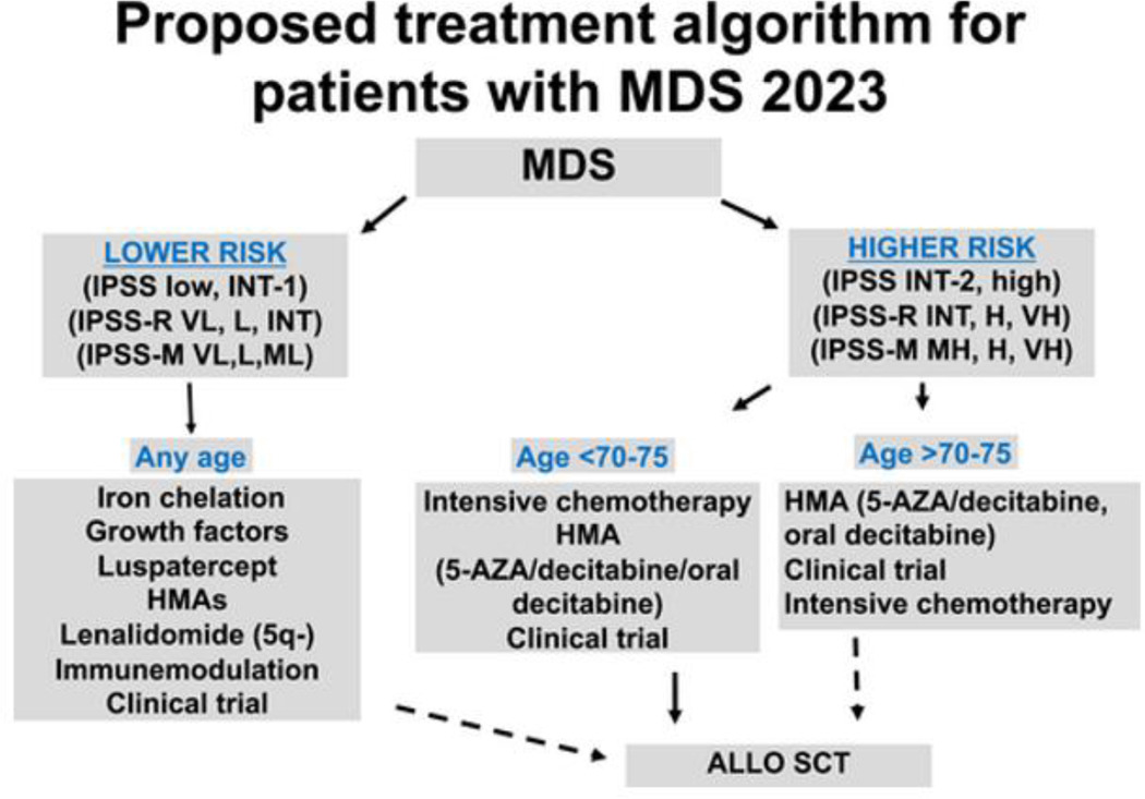 Therapy is selected based on risk, transfusion needs, percent of bone marrow blasts, cytogenetic and mutational profiles, comorbidities, potential for allogeneic stem cell transplantation (alloSCT), and prior exposure to hypomethylating agents (HMA). Goals of therapy are different in lower risk patients than in higher risk and in those with HMA failure. In lower risk, the goal is to decrease transfusion needs and transformation to higher risk disease or AML, as well as to improve survival. In higher risk, the goal is to prolong survival. In 2020, two agents were approved in the US for patients with MDS: luspatercept and oral decitabine/cedazuridine. In addition, currently other available therapies include growth factors, lenalidomide, HMAs, intensive chemotherapy, and alloSCT. A number of phase 3 combinations studies have been completed or are ongoing at the time of this report. At the present time there are no approved interventions for patients with progressive or refractory disease particularly after HMA based therapy. In 2021, several reports indicated improved outcomes with alloSCT in MDS as well as early results from clinical trials using targeted intervention.