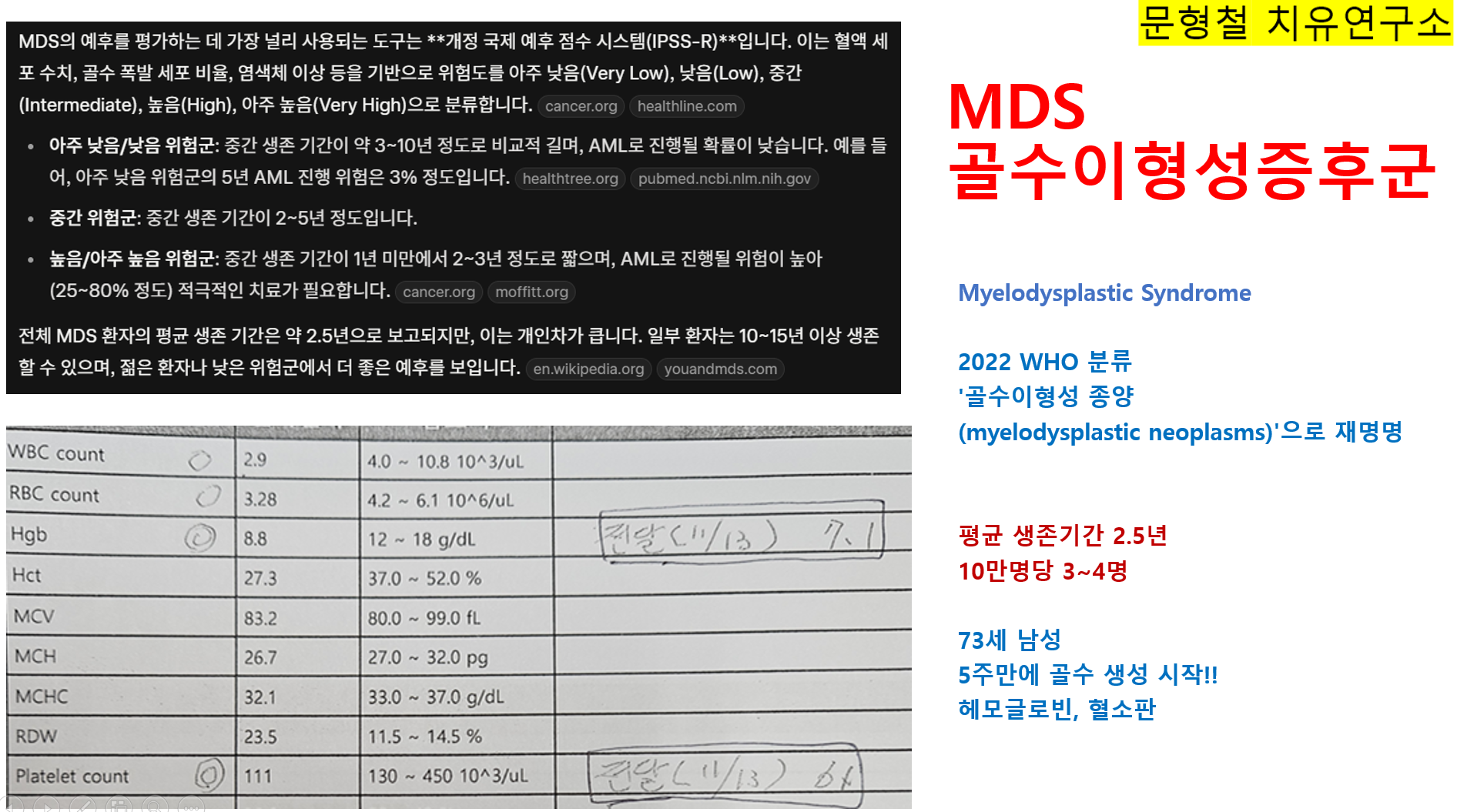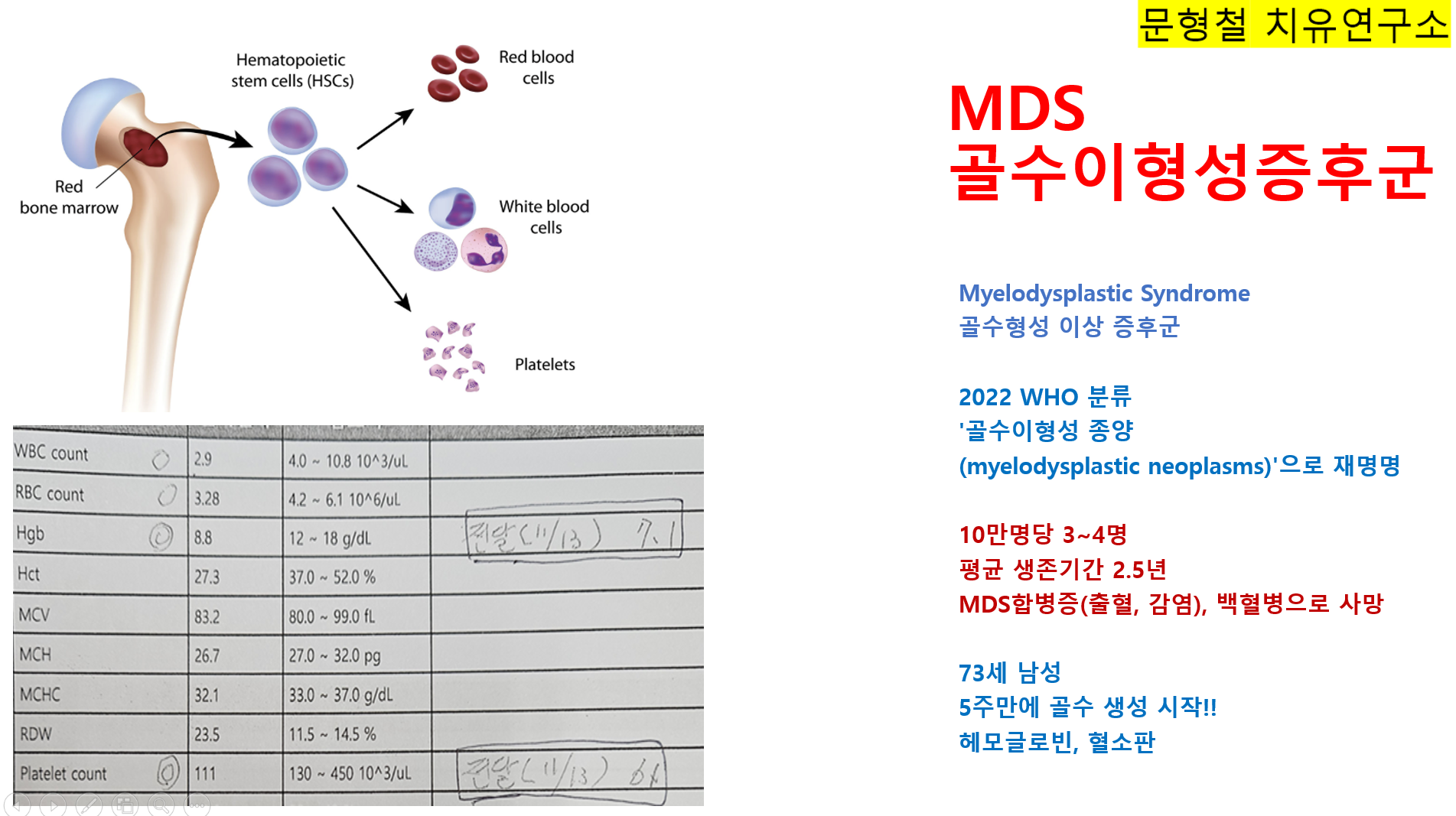 - 배경 지식: MDS는 미국에서 인구 10만 명당 3-4명 발생하며, 60세 이상에서 급증(7-35명/10만). 남성 우세하며, 이전 화학/방사선 치료와 연관. 주요 문제: 빈혈, 감염, 출혈, AML 진행(대부분 MDS 합병증으로 사망).
