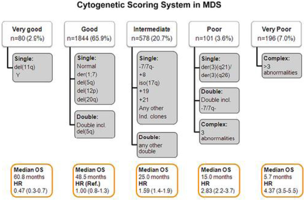 - Figure 1: MDS 염색체 분류 (5 위험군: very good ~ very poor, 예: del(5q), -7).