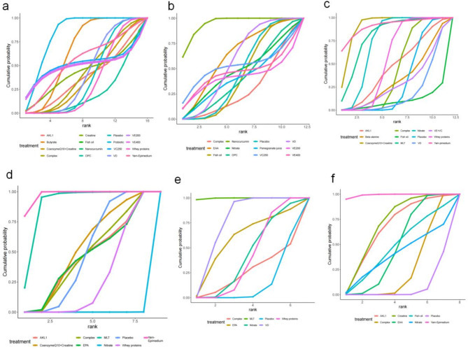 The cumulative sorting curve. Panels (a-f): Each panel represents the probability ranking of interventions for specific outcomes: a. Forced Expiratory Volume in One Second (FEV1) (% of predicted); b. The ratio of Forced Expiratory Volume in One Second to Forced Vital Capacity (FEV1/FVC); c. 6-minute walk distance (6MWD); d. modified Medical Research Council (mMRC) Dyspnea Scale; e. COPD Assessment Test (CAT); f. St. George’s Respiratory Questionnaire (SGRQ). EAA = Essential amino acid, EPA = Eicosapentaenoic acid, MLT = Melatonin, VD = Vitamin D, VC = Vitamin C, VE = Vitamin E, OPC = Oligomeric proanthocyanidin, AKL1 = a patented botanical formulation containing extracts of Picrorhiza kurroa, Ginkgo biloba, and Zingiber officinale