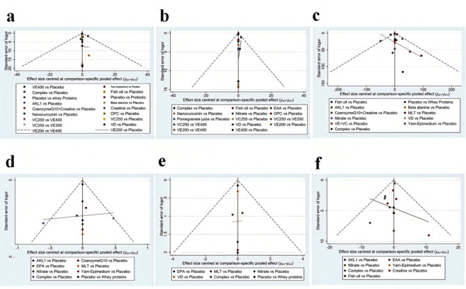 Funnel plots of the outcomes: (a) Forced Expiratory Volume in One Second (FEV1) (% of predicted); (b) The ratio of Forced Expiratory Volume in One Second to Forced Vital Capacity (FEV1/FVC); (c) 6-minute walk distance (6MWD); (d) modified Medical Research Council (mMRC) Dyspnea Scale; (e) COPD Assessment Test (CAT); (f) St. George’s Respiratory Questionnaire (SGRQ). EAA = Essential amino acid, EPA = Eicosapentaenoic acid, MLT = Melatonin, VD = Vitamin D, VC = Vitamin C, VE = Vitamin E, OPC = Oligomeric proanthocyanidin, AKL1 = a patented botanical formulation containing extracts of Picrorhiza kurroa, Ginkgo biloba, and Zingiber officinale