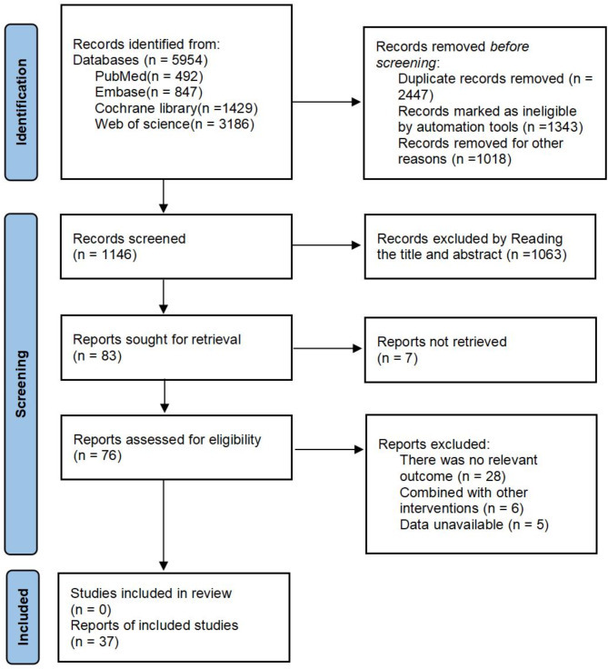 A total of 5954 records were initially identified through database searching. After removing 2447 duplicates, and excluding 1341 records flagged as ineligible by automation tools as well as 1018 records excluded for other reasons, 1146 records remained for title and abstract screening. Following this step, 1063 records were excluded based on title and abstract review, resulting in 83 full-text articles assessed for eligibility. Ultimately, 37 studies met the inclusion criteria and were included in the final review. The study selection process is illustrated in the PRISMA flow diagram (Fig. 1).