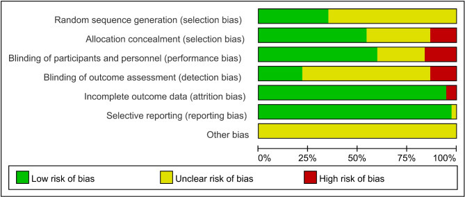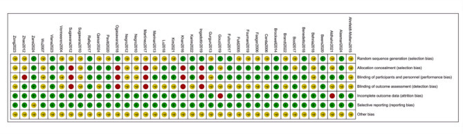 The results of the RoB analysis show that, 13 studies provided a thorough description of their randomization methods and were classified as having a low risk of bias, while the risk of bias in the remaining studies was unclear. Five studies exhibited elevated risks related to allocation concealment, investigator and participant blinding, and outcome assessment blinding. Additionally, 2 studies had incomplete outcome data.The assessment of the risk of bias for the included studies is illustrated in Figs. 2 and 3.