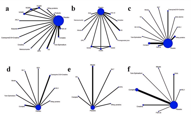 Network plots of the included nutritional supplements and their connections based on the efficacy outcomes. The size of the nodes corresponds to the number of studies involving that particular intervention. The thickness of the edges represents the number of studies comparing the two interventions. Panels (a–f): Each panel represents a specific outcome or analysis based on the included studies: a. Forced Expiratory Volume in One Second (FEV1) (% of predicted). b. The ratio of Forced Expiratory Volume in One Second to Forced Vital Capacity (FEV1/FVC). c. 6-minute walk distance (6MWD); d. modified Medical Research Council (mMRC) Dyspnea Scale. e. COPD Assessment Test (CAT). f. St. George’s Respiratory Questionnaire (SGRQ). EAA = Essential amino acid, EPA = Eicosapentaenoic acid, MLT = Melatonin, VD = Vitamin D, VC = Vitamin C, VE = Vitamin E, OPC = Oligomeric proanthocyanidin, AKL1 = a patented botanical formulation containing extracts of Picrorhiza kurroa, Ginkgo biloba, and Zingiber officinale