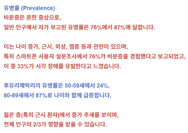 최근(2023-2026) 연구 중 비문증의 유병률, 병기, 예후를 다룬 주요 논문을 아래에 정리했습니다. (PubMed 중심으로 검색)
