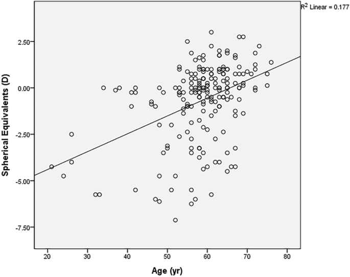 X-axis presents the age when the first vitreous floater symptom occurred, while Y-axis presents the spherical equivalent value in diopters (D). The oblique line of best fit is showing a positive correlation between the spherical equivalent value and age. (r = 0.421, p < 0.001 in the Pearson’s correlation analysis).