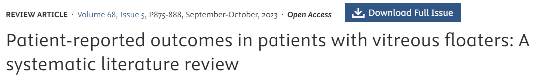 - Patient-reported outcomes in patients with vitreous floaters (2023, Surv Ophthalmol) - 환자 보고 결과 측정 도구 리뷰. 삶의 질 영향 강조, 유병률 및 예후 관련 PROMs 부족 지적.