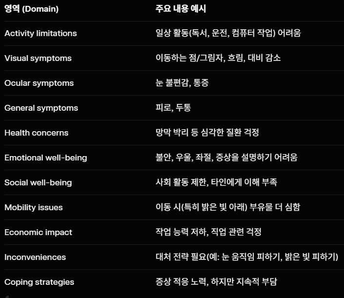 | 비문증(유리체 부유물, vitreous floaters)이 환자의 삶의 질에 미치는 영향을 측정하고 치료 효과를 평가하기 위해 **환자보고 결과물(Patient-Reported Outcome Measures, PROMs)**이 필수적입니다. 이 논문은 비문증 환자를 대상으로 PROM을 사용한 모든 연구를 체계적으로 검토하여, 기존 PROM의 내용 범위, 개발 과정, 심리측정학적 품질(psychometric quality)을 평가합니다. 방법