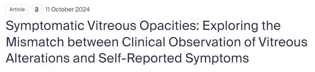- Symptomatic Vitreous Opacities: Exploring the Mismatch between Clinical Observation and Self-Reported Symptoms (2024 Oct, J Clin Med) - 젊은 환자 증상 vs. 임상 소견 불일치 분석. 예후: 주관적 증상 강하지만, 객관적 변화 적음.