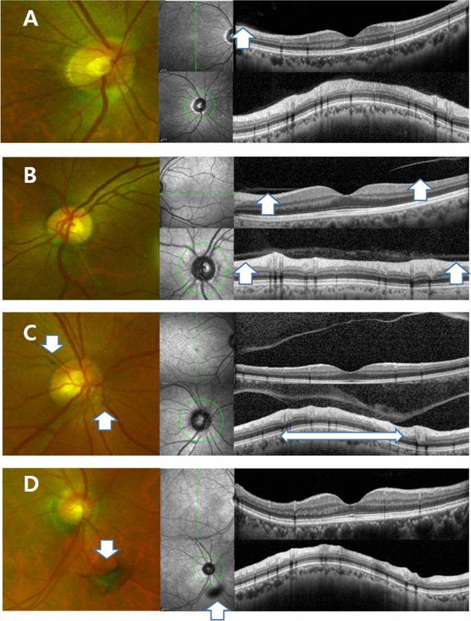 Ultra-wide field scanning laser ophthalmoscopy (UWF) and Spectral Domain Optical Coherence Tomography (SD-OCT) images of patients who experienced floater for the first time in their life. (A) PVD stage 1. 59 year-old male. No definite change was noticed around optic disc in UWF. Note subtle change which is presenting the initiation of PVD (Posterior Vitreous Detachment, white arrow). (B) PVD stage 2. 60 year-old female. No definite change was noticed around optic disc in UWF. In the macular SD-OCT image, perifoveal posterior vitreous detachment (PVD) is in progress (white arrows) remaining posterior vitreous attached to fovea. In glaucomatous SD-OCT, PVD is in progress in some part of the optic disc margin (arrow), while most of the optic disc remains attached to the vitreous body. (C) PVD stage 3. 61 year-old male. Note two pVOs (peripapillary vitreous opacity, white arrows) noticed around the optic disc. In the macular SD-OCT image, PVD occurred throughout the entire macula. In the glaucomatous SD-OCT image, PVD is in progress while about half of the optic disc margin is detached to the vitreous body (a wide bidirectional arrow). (D) PVD stage 4. 66 year-old female. Note a dense pVO (white arrow) resembling a Weiss ring. In the macular SD-OCT image, reflectivity of vitreous body is not observed in hollow vitreous cavity. In glaucomatous SD-OCT image, reflectivity of vitreous body is not observed either. A shadow of pVO (arrow) is identified.