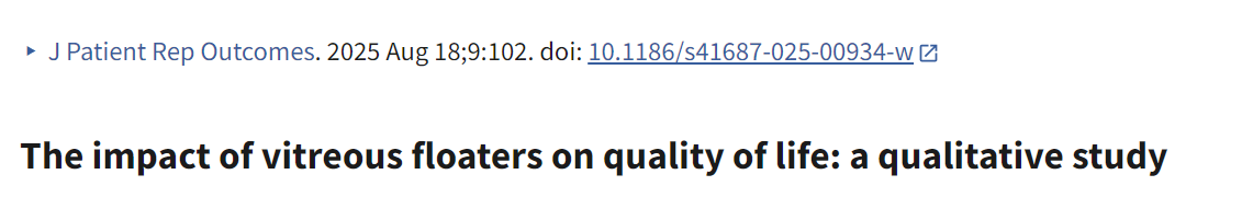 - The impact of vitreous floaters on quality of life: a qualitative study (2025 Aug, J Patient Rep Outcomes) - 44명 환자 인터뷰 기반. 유병률 87% 언급, 삶의 질 영향(시각 증상, 불편, 감정적 고통) 강조. 예후: 만성적이지만 적응 가능, 치료 위험 논의.
