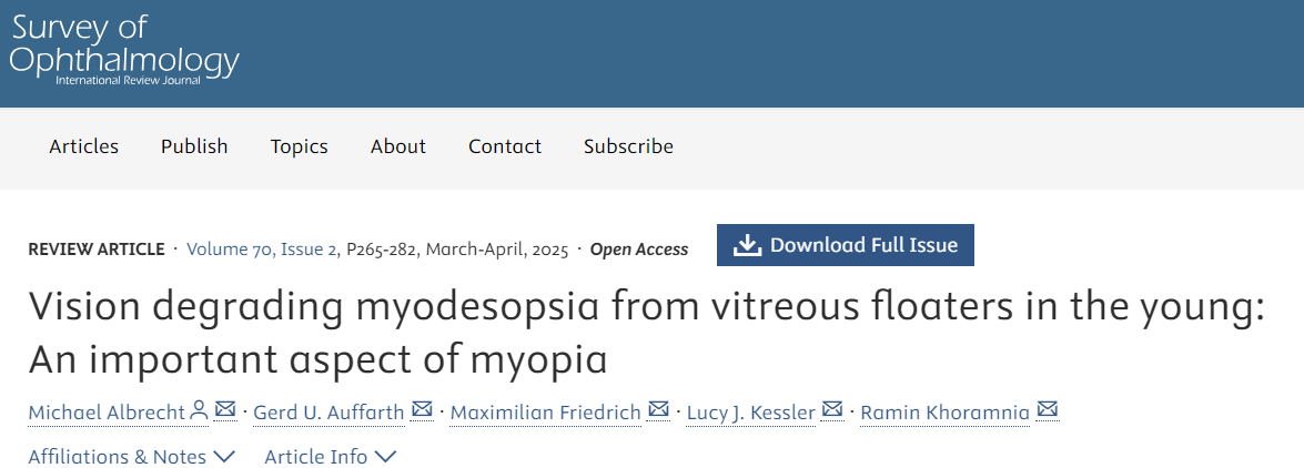 - Vision degrading myodesopsia from vitreous floaters in the young (2024, Surv Ophthalmol) - 젊은 근시 환자 중심 리뷰. 유병률: 근시 증가와 비례. 병기: 유리체 변화 과정 설명. 예후: 삶의 질 영향 크지만, 치료 옵션(레이저, 수술) 논의.