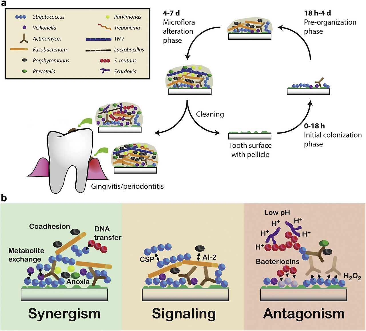 - b: 성숙 바이오필름 내 미생물 간 상호작용 유형 (Synergism, Signaling, Antagonism) 세부 메커니즘.