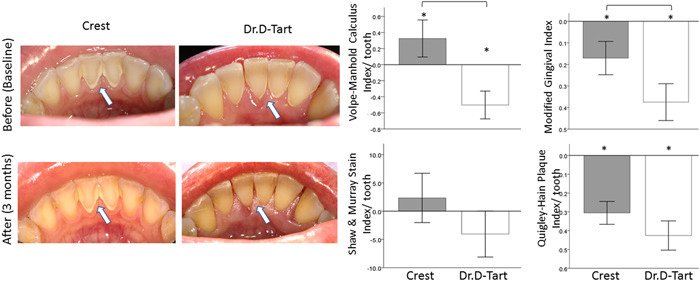 - 스케일링 후 6개월(총 9개월 시점) → Crest 그룹 치석 점수가 Dr. D-Tart 그룹보다 42% 더 높음 (p=0.0692, 경계선 유의)