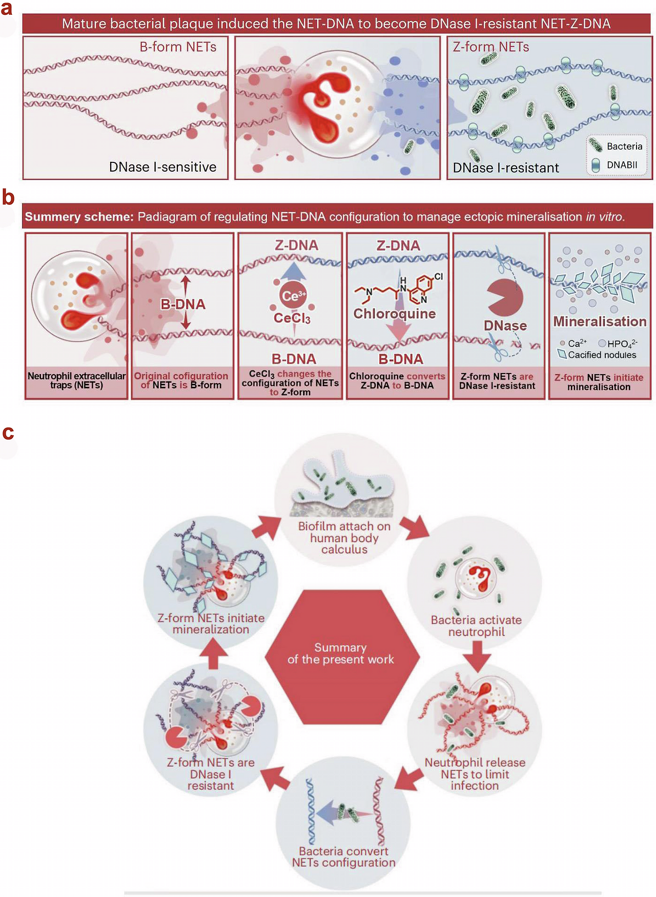 - 최근 핵심 발견: 성숙 바이오필름 내 세균이 중성구 세포외 트랩(NETs)의 DNA를 DNase I에 의한 분해로부터 보호(resistance)하게 만들어 아파타이트(apatite) 핵형성·성장을 촉진 (2024 Nat Biomed Eng 관련 연구 인용).
