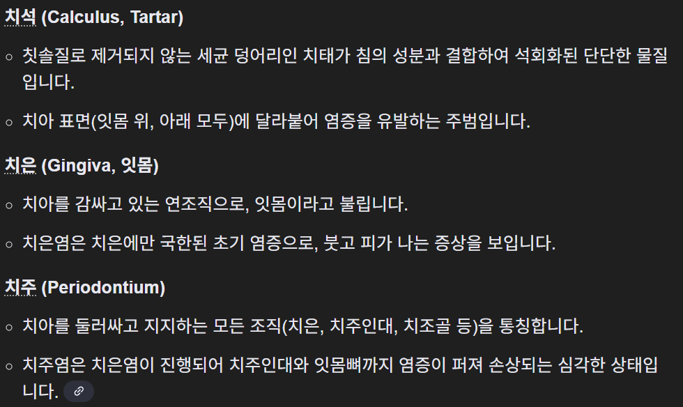 - Alveolar bone → 치조골 (치조뼈) 치아 뿌리가 박혀 있는 턱뼈 부분으로, 치아를 단단히 고정합니다. 치주염이 심해지면 이 치조골이 흡수(소실)되어 치아가 흔들리게 됩니다. 그림에서 갈색 점무늬 영역입니다.