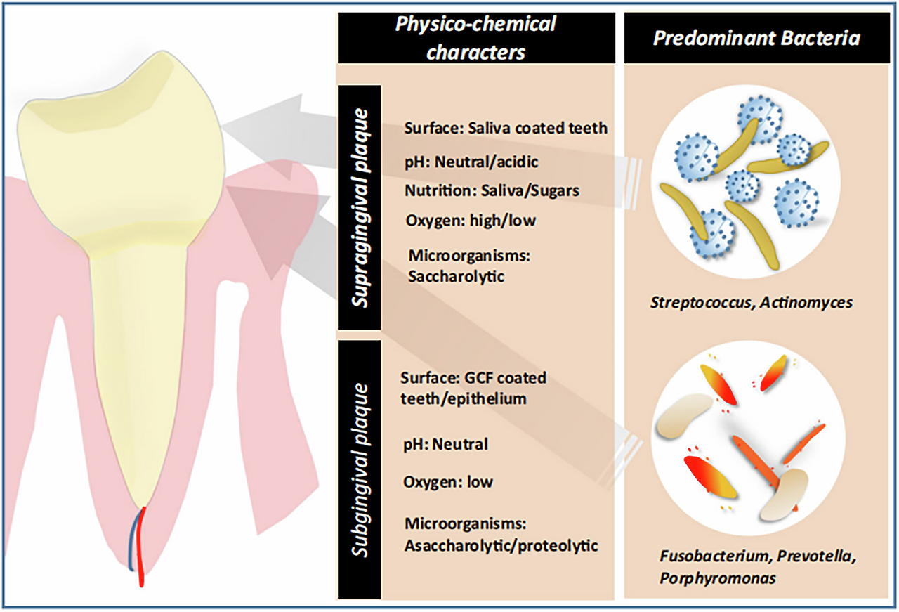 - 플라크(biofilm)가 치아 표면에 부착 → 국소 칼슘·인 농도 상승 → 생물광물화(biomineralization) 촉진.