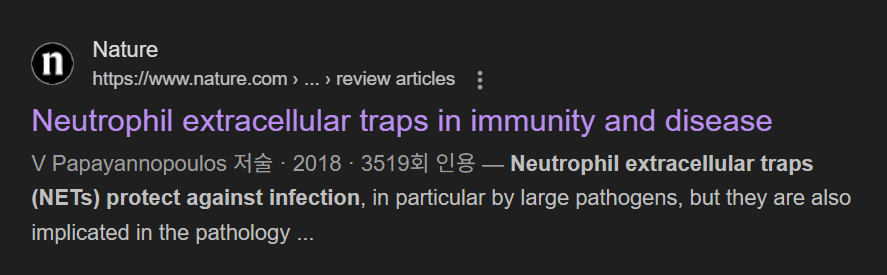 - 호중구 세포외 트랩(NETs)은 감염, 특히 대형 병원체로부터 보호하는 역할을 하지만, 점점 더 많은 면역매개 질환과 관련된 병리에도 관여한다.