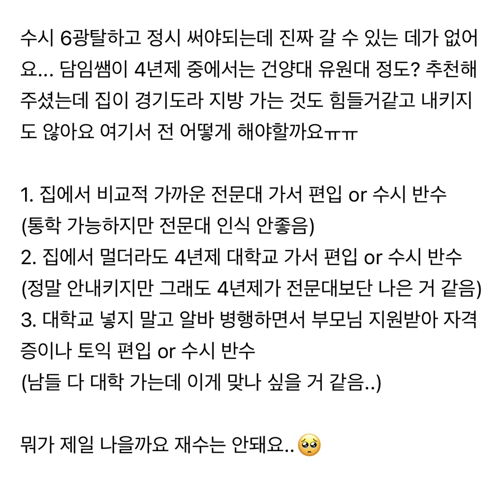 재수 안 할꺼라면, 전문대 가는게 어떨까? 싶습니다.