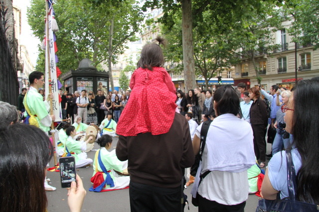 파리 생미셀 거리 중세 박물관 앞에서, 한복을 화사하게 차려 입은 엘리즈가 하께 어우러져 춤을 추고