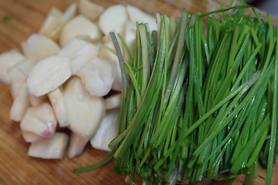 ㉠ 마늘은 편을 썰어두고 달래는 손질하여 적당한 크기로 썰어둔다.