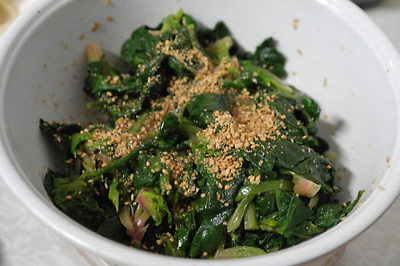 ▶ 재료 : 시금치 1단, 간장 1숟가락, 깨소금, 참기름 약간