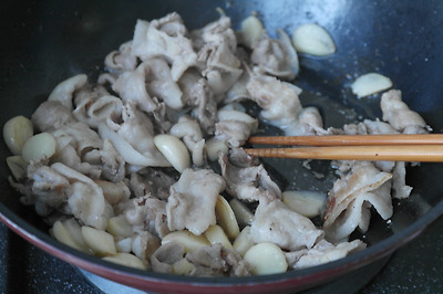 ㉡ 대패 삼겹살, 소금, 후추, 마늘을 넣고 볶아준 후 접시에 담아준다.