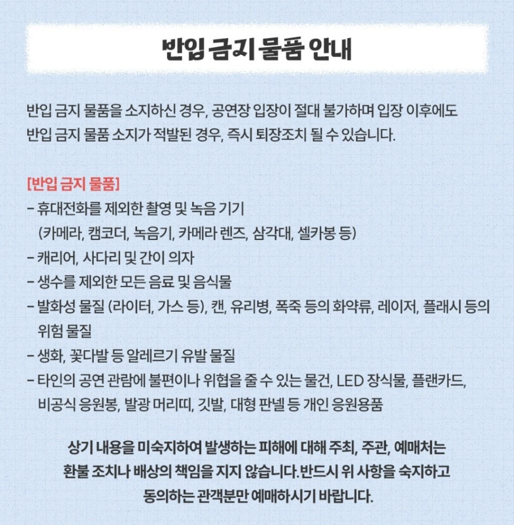 1)카메라, 캠코더, 녹음기, 삼각대, 셀카봉, LED 응원도구, 머리띠, 피켓, 깃발, 플랜카드 등은 반입이 금지됩니다.