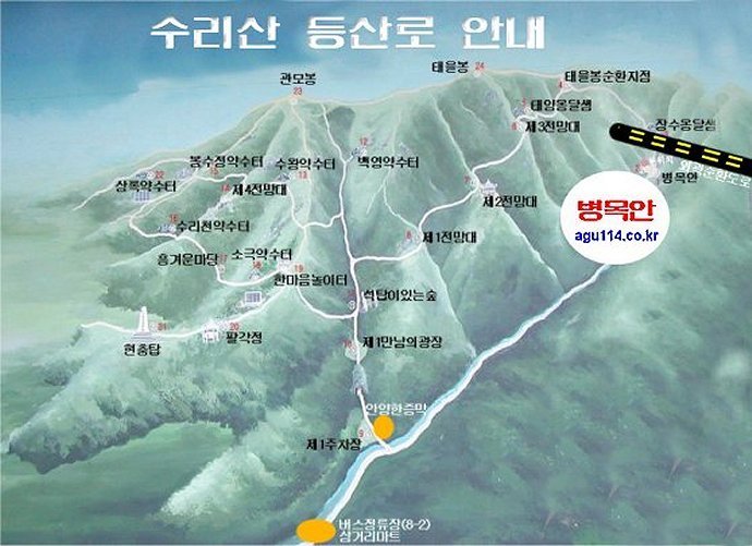 1. 수리약수터 입구~관모봉~태을봉~노랑바위~수리약수터 입구(약2시간)