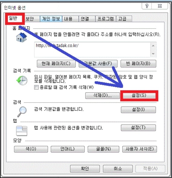 인터넷 옵션 일반탭 검색기록 부분에서 설정을 눌러주세요