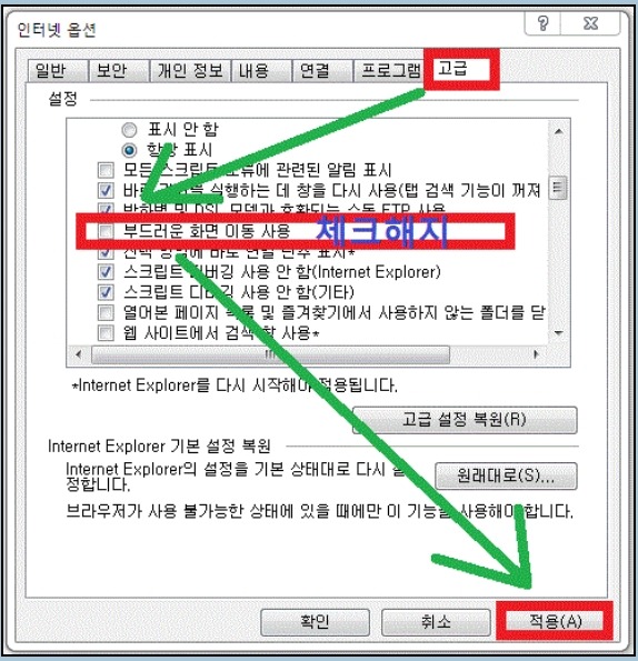 인터넷 옵션 고급 탭 설정에서 부드러운 화면 이동 사용을 체크해지해주시는것이