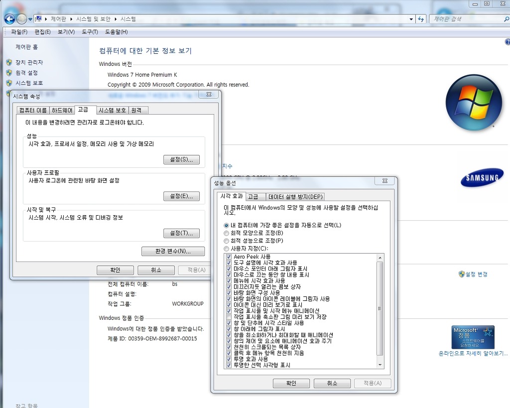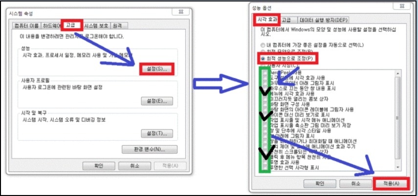 시각 효과 탭에서 최적 성능으로 조정 눌러주시고 원하시는 성능을 눌러주신 후 적용을 눌러주시는것이