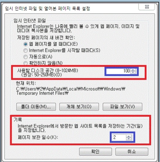 임시 인터넷 파일 사용할 디스크 공간을 줄여주시고 ,